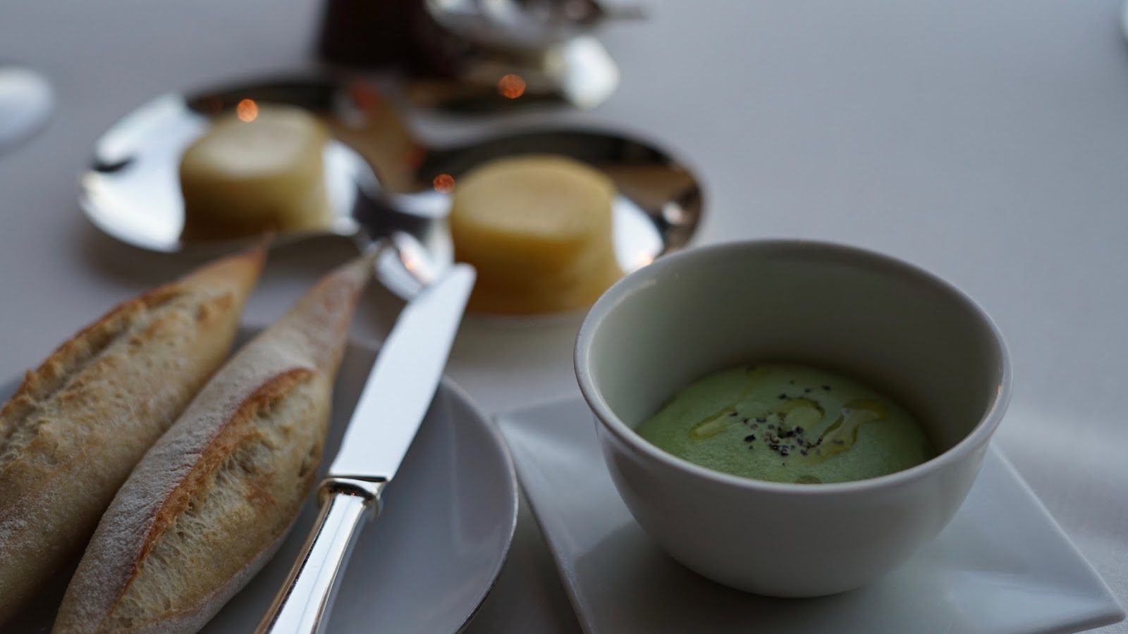 A lot happened very quickly after we placed our orders, firstly, some warm cheesy puffs were delivered; we were presented with a plethora of bread roll options, with lovely room temperature salted and unsalted butter; finally, we were given our amuse bouche, a delicious small bowl of fresh peas bathed in a tomato confit and finished of the a light an airy pea foam. The fresh and intense flavours balanced wonderfully, the acidity from the tomato working in harmony with the sweetness of the pea.
