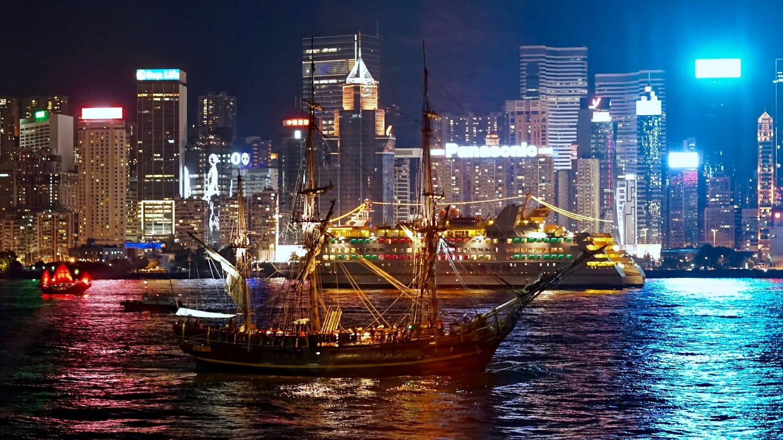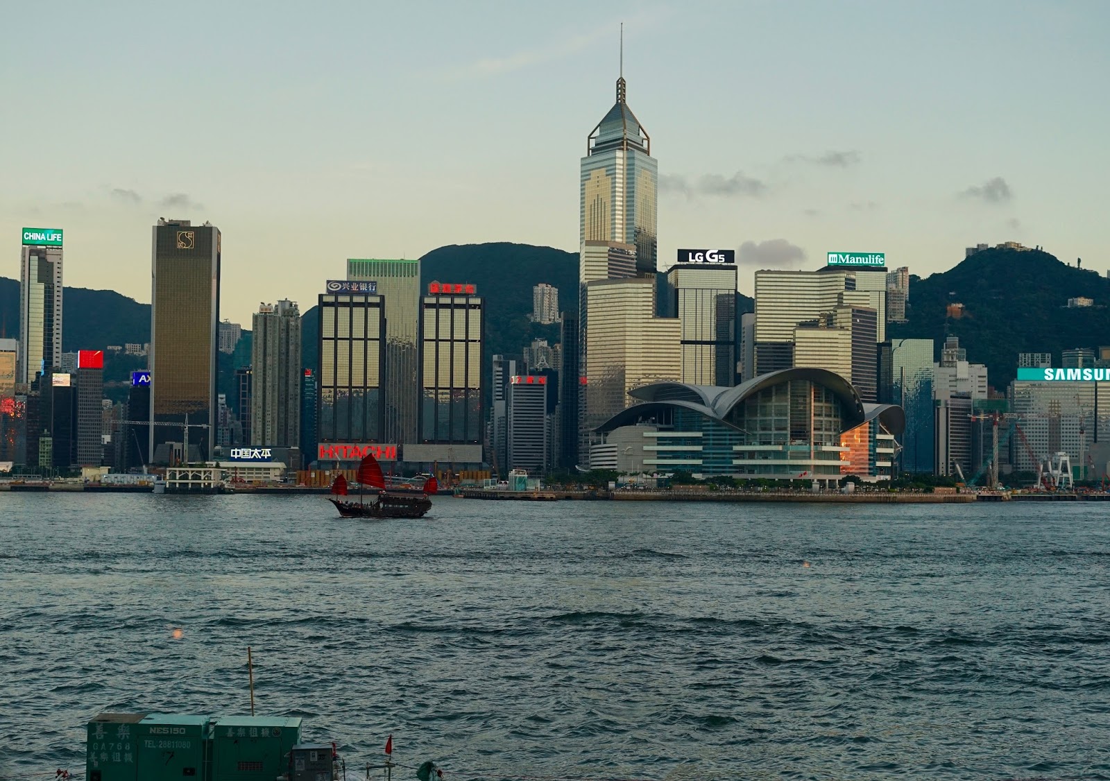 It was in between our starters and mains that the twilight gave way to darkness and Hong Kong Island came alive. In all of our time in HK, it was the first time I remember just watching the sun slowly glide over the mountains and the natural light give way to the artificial light that comes from so many high rise buildings equiped with all sorts of neon signs. Even better than that amazing skyline was watching all sorts of sea vessels moving up and down the harbour, none better than when we witnessed an old tall ship glide in front of a modern day behemoth.