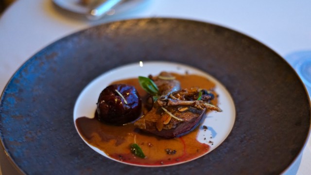The girl’s main of young pigeon from Bresse with figs and dried fruits was presented and I was just a little disappointed with the presentation, especially after witnessing what could come out of the kitchen. Served on a white plate with black a large black border, the pigeon was lost on the plate, especially hidden by the jus. Again, luckily you don’t judge a dish on its appearance, it is all about the flavour, and the game bird was full flavoured and expertly cooked. Right on medium rare, the tender bird tasted earthy and rich, helped along with some acidity and sweetness from the roasted fig and sticky jus.
