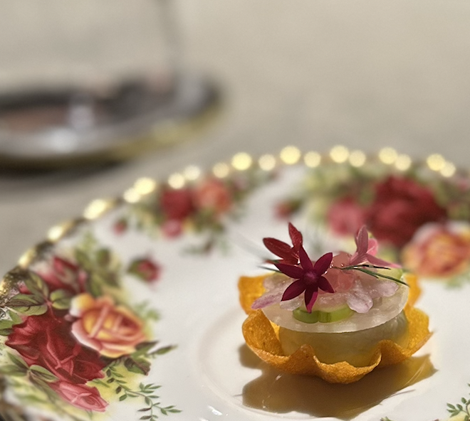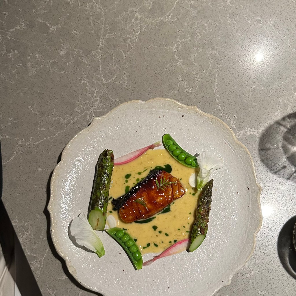 We started off the night with an asparagus and curry leaf tart, which was beautifully presented on a dainty and ornate plate with gold edging. A simple quick bite that we instantly devoured had a lovely balance of crunch and flavour. The hints of sweetness of the asparagus were there, but not overpowering. A great start with more to come.