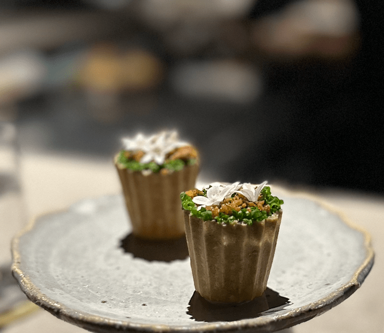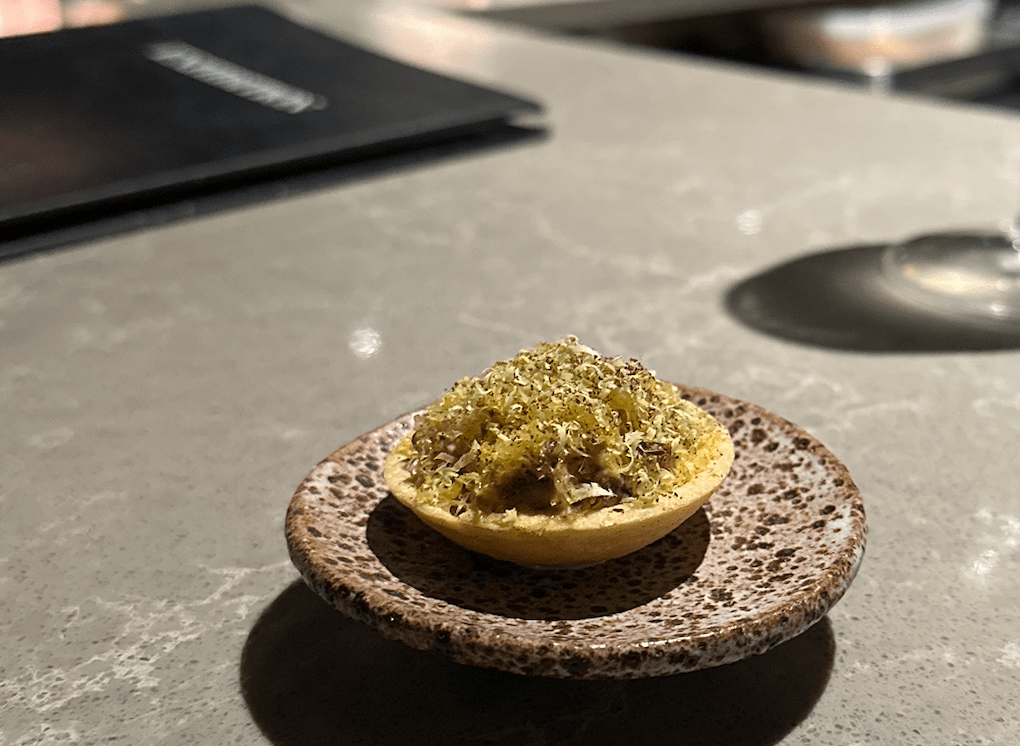 Next was another simply presented bite that was filled with confit duck and had hints of lemongrass and kohlrabi. Similar looking tarts had been present in all of our previous visits, but this time the texture was softer on the palate and had a bit more of a punch than the first bite.