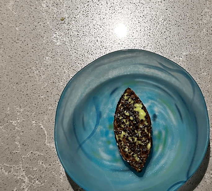 Simply called ‘Nduja + Lemon tart, the next dish was so beautifully presented on an ocean blue plate, so that the colours on the bite popped and called our names. As you’d have expected with ‘nduja as the main dish, it was hot… Very hot, almost too hot for me to bear. It has a sweet hot chorizo feel about it, and after devouring in one bite, just as I thought I couldn’t bear the heat any more, the sweetness kicked in to save me…