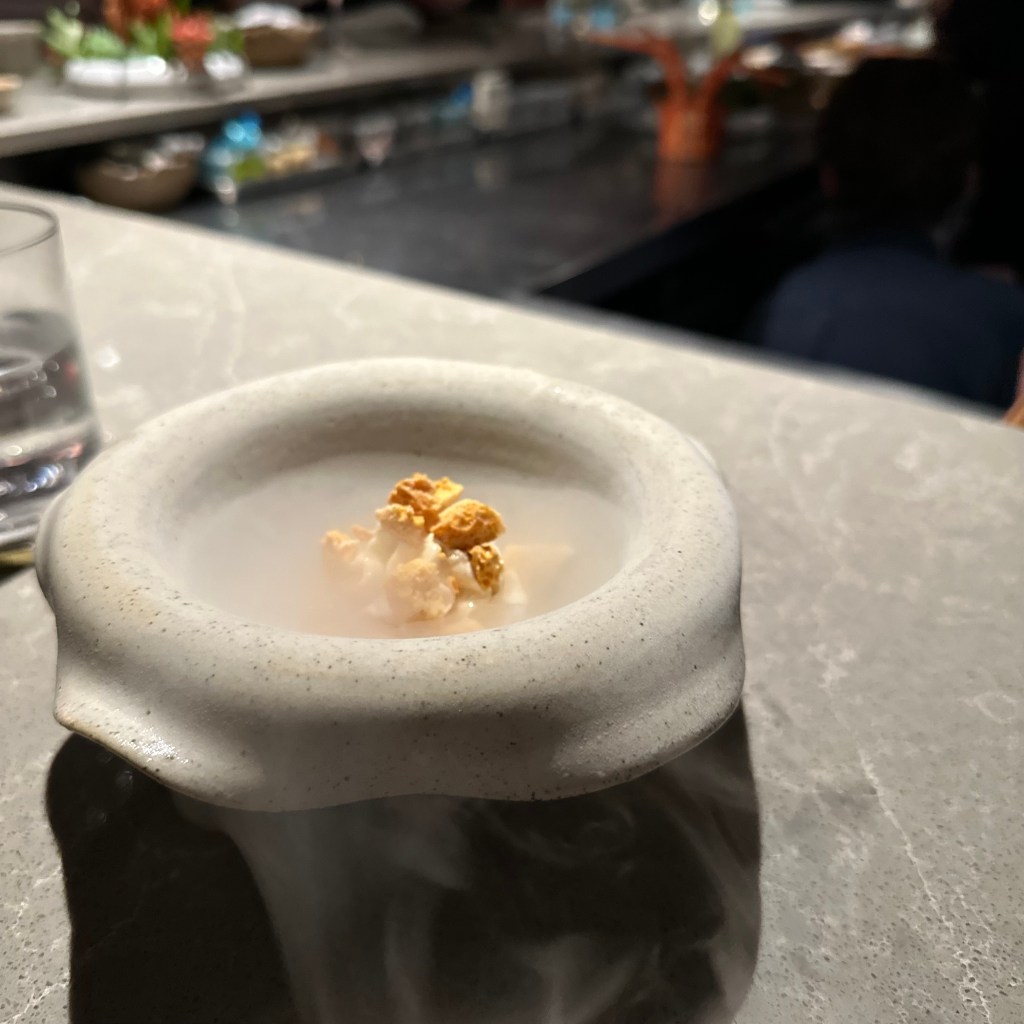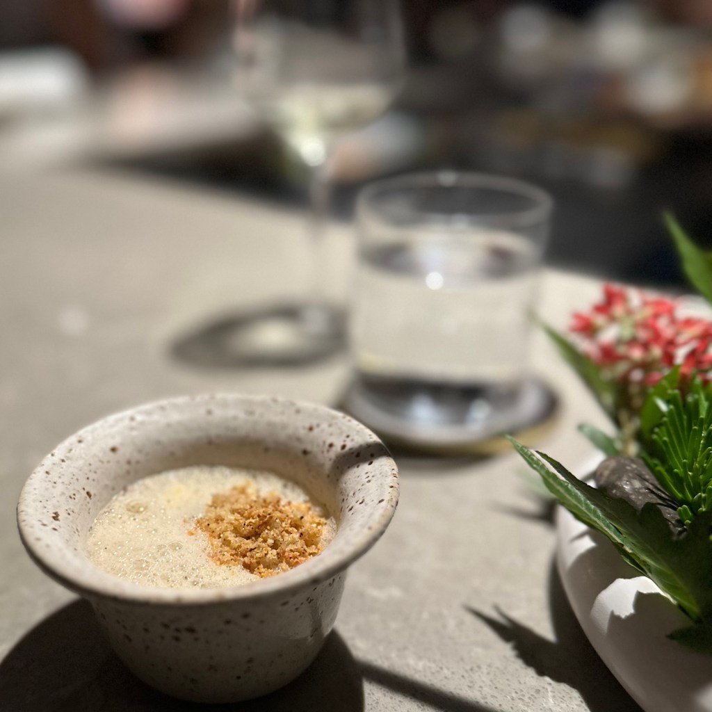 Chu-toro is the fatty part of tuna that is considered the most like the wagyu version of fish; it’s buttery and fatty and just incredibly delicious. So a generous dish of tuna Chu-toro with brown rice miso and fragrant Kombu was next, the sweet and fatty tuna underneath a lightly textured foam. We went digging and were rewarded with a sweet and subtle set of flavours that lingered on the palate for the new moments it took to look towards our next bite…