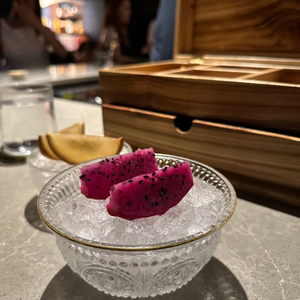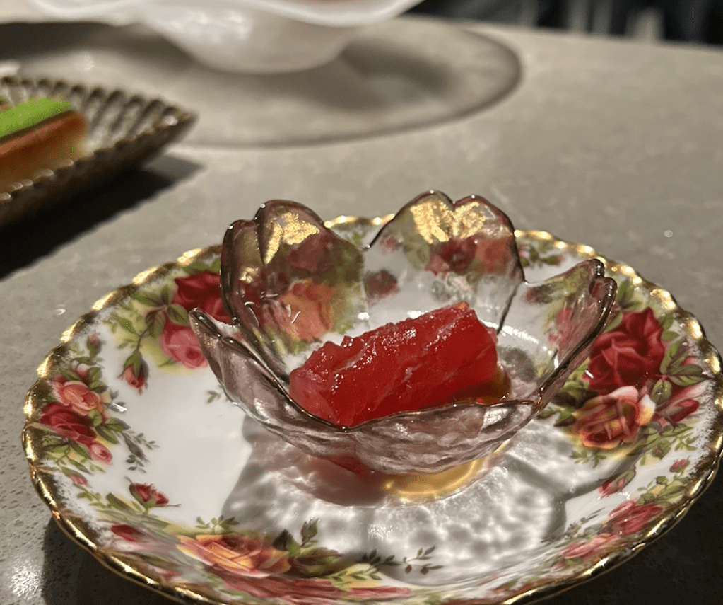 The next set of three bites started with a 14 day dry aged yellowfin tuna senaka with shish and yuzu kosho, again presented on a gilded floral plate. It was fresh. with that unmistakable yuzu (not quite sweet and not quite tart) flavour balancing out the sweetness of the tuna. It was a small bite but delicious.